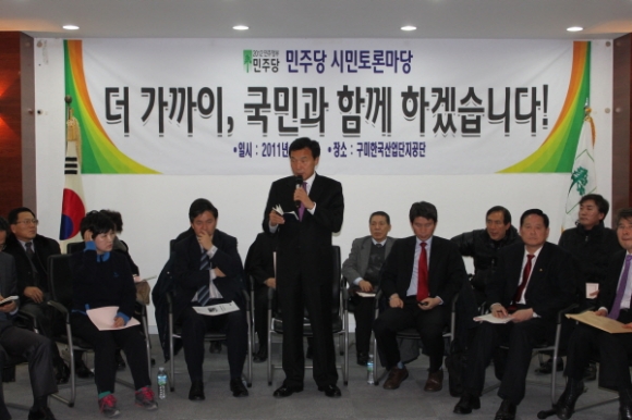 민주당 지도부가 많이 말씀드리는 자리보다 듣는 자리가 되어야 되는 자리인 만큼, 민주당이 이렇게 지역순회로 구미까지 오게 된 것은 폭주기관차 처럼 제동장치 없이 내달리는 이명박 정부의 반 노동자, 반 지방정권, 반 서민 폭정을 알려드리고 동시에 우리 국민들의 가엽고 아픈 부분들을 새겨듣고 민심을 제대로 파악하는 그런 목적으로 다니고 있다. 기탄없이 많이 말씀해주시고 민주당이 모자란 부분을 많이 채우는 그런 자리로 삼도록 귀한 말씀해주시기 바란다.