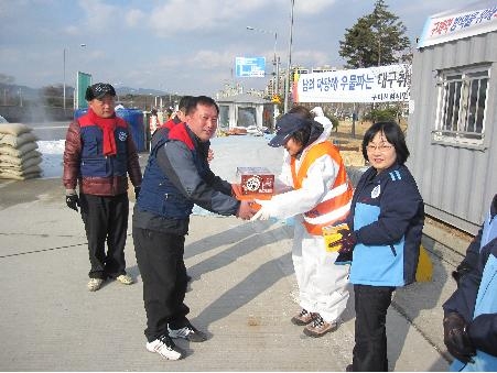 방역하는 이들에게 밀감, 컵라면, 음료 등을 제공했다.