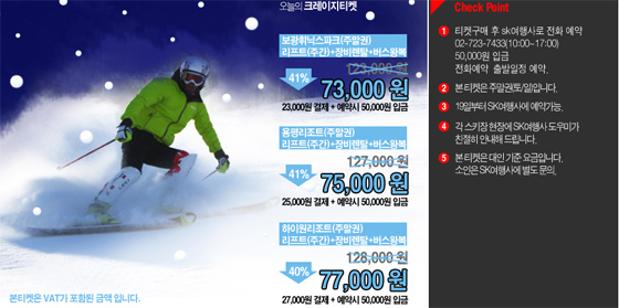 크레이지티켓 스키장 할인 상품은 2011년 1월 19일부터 유효하며, 1인당 최대 10장까지 구매가 가능하다.
