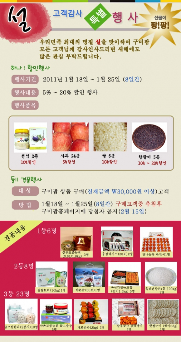 구미팜 관계자는 "모든 품목에 대해 무료배송을 실시하고, 1%포인트제를 도입,적립한 후 사용할 수 있기 때문에 어려운 시기에 구매에 많은 도움이 될 것으로 기대한다 "며 "설날 선물로 사과,배,곶감,버섯,토종꿀,한과,홍삼 엑기스를 추천했다.