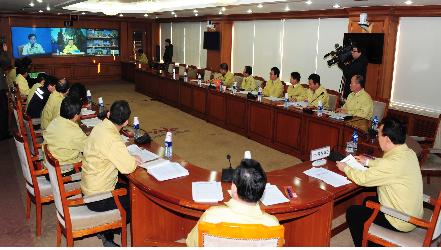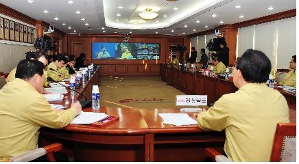 김관용 도지사는 19일 도청 제1회의실 행정안전부장관 주재 구제역 방역관련 영상회의에서 설 연휴를 맞아 유동인구 증가에 대비한 최대한의 방역활동을 통해 전염원 확산을 원천적으로 차단하고, 구제역 대국민 홍보 강화와 방역의 실효성을 높이는 한편, 축산물 소비 진작 등 설연휴 구제역특별방역대책 추진상황을 설명했다.