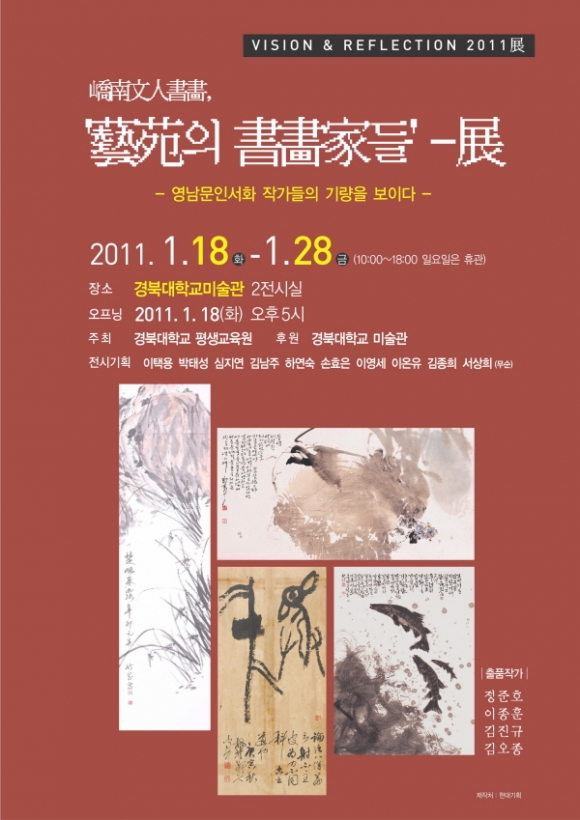 경북대학교미술관이 대학원 석사과정 재학생들과 큐레이터가 되려고 준비하는 이들에게 전시기획의 전 과정을 실습할 기회를 제공하기 위해 마련한 프로젝트 VISION & REFLECTION 2011 展의 일환인 . 교남문인서화, '예원의 서화가들'展은 각기 다른 5회의 기획전시 중 세 번째의 전시다.