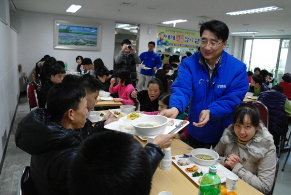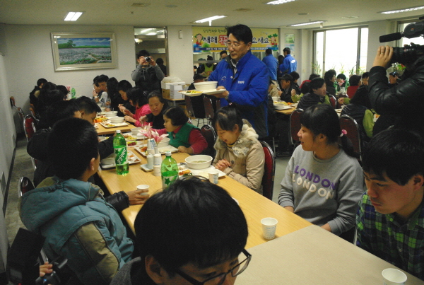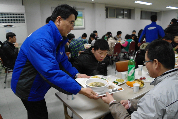 24일 구미시 장애인종합복지관에서 저소득가정 장애인 150여명과 북한이주 새터민 가정 30세대를 초청한 가운데 사랑의 떡국 나눔 봉사활동을 펼친 구미사업장에서는 이날 전우헌 공장장을 비롯한 임직원 및 가족 등 총 20여명의 봉사자가 참여했다.