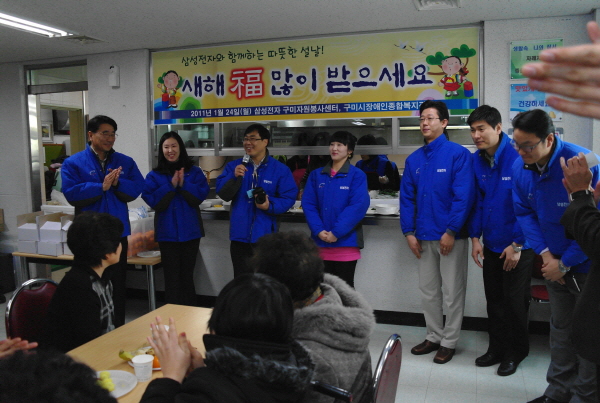 한편 삼성전자의 개별 봉사팀에서도 경로당, 공부방, 장애인 시설 등 구미지역 내 32개 봉사처 총 2천100여명을 대상으로 설 맞이 봉사활동을 펼쳤다. 평소 꾸준히 봉사활동을 펼치고 있는 임직원들은 봉사처를 직접 방문한 가운데 겨울맞이 생활용품을 전달하고 함께 명절 전통놀이를 하면서 말벗이 되어주는 등 명절의 정을 나누는 특별한 시간을 가졌다.