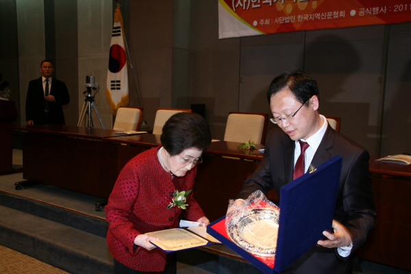 사단법인 한국지역신문협회(회장 정태영)가 개최한 ‘지역신문의 날 및 비전선포식’에서 고 김대중 전 대통령 부인인 이희호 여사가 ‘지구촌 희망펜 상’ 전체대상을 수상하는 영예를 안았다.
