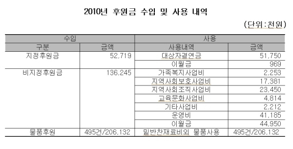 금오종합사회복지관(관장 법등)에서 ‘2010년도 후원금 수입 및 사용 결산보고회’를 갖고 지정후원금 5천2백719천원, 비지정후원금 1억3천6백245천원, 물품후원 495건에 대한 사용내역을 보고했다.
