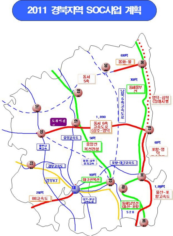 2011년도 주요 SOC 예산을 살펴보면 ◆고속도로는 △지난해 7월 착공한 상주~영덕 고속도로건설 1천890억원 △포항~울산고속도로건설 1천800억원 △88고속도로 확장공사(성산~경남 도계) 292억원 등 5개 사업지구에 4천142억원을 투입하게 된다. 88고속도로 확장공사는 연말 완공을 목표로 추진중이며,경부고속 도로 영천~언양간 확장은 올해부터 본격 추진할 계획이다.