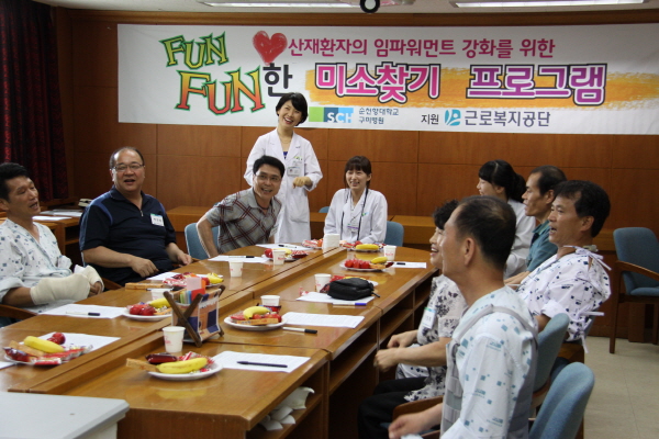 순천향병원은 지난해 ‘산재환자의 임파워먼트 강화를 위한 뻔뻔(fun fun)한 미소찾기’를 주제로 자기애와 긍정적 의식을 강화할 수 있도록 웃음치료, 원예치료, 작업치료, 레크레이션, 개별면담 등 다양한 프로그램으로 2010년 전국 최우수기관으로 선정되는 영예를 안았다.