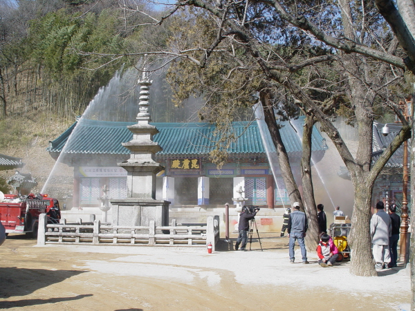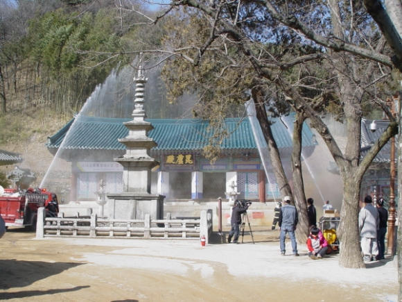 직지사 대웅전(보물 제1576호) 주변 비로전에서 실시한 소방훈련은 김천시와 김천소방서, 김천경찰서 등 유관기관과 직지사 자위소방대 합동으로 실시됐다.