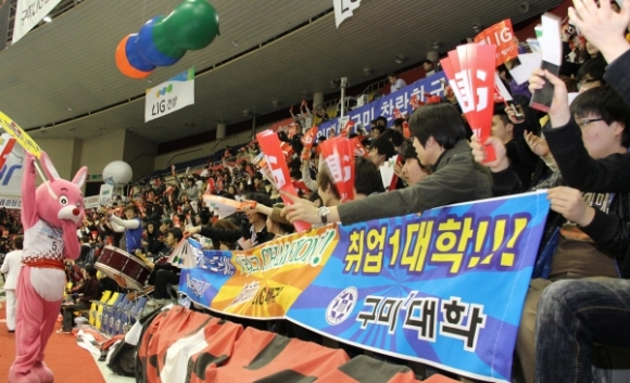 구미1대학(총장 정창주)은 구미를 연고로 하는 LIG배구단과 우리캐피탈과의 경기가 펼쳐진 지난 8일을 ‘구미1대학의 날’로 정하고 재학생들의 뜨거운 응원 함성으로 경기장을 가득 메웠다.